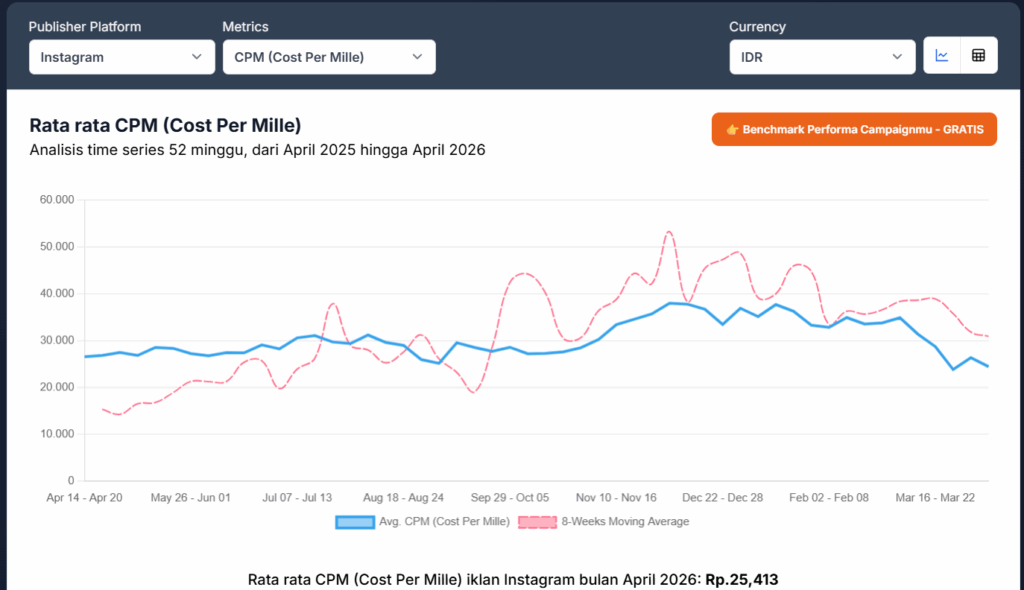 Patokan yang lebih relevan datang dari data advertiser lokal. Berdasarkan analisis time series selama 52 minggu, yaitu periode Juli 2024 sampai Juni 2025, dari belanja iklan lebih dari Rp25 miliar per bulan khusus audiens Indonesia, rata-rata CPM Instagram Ads Indonesia adalah Rp25,413 per 1.000 tayangan.